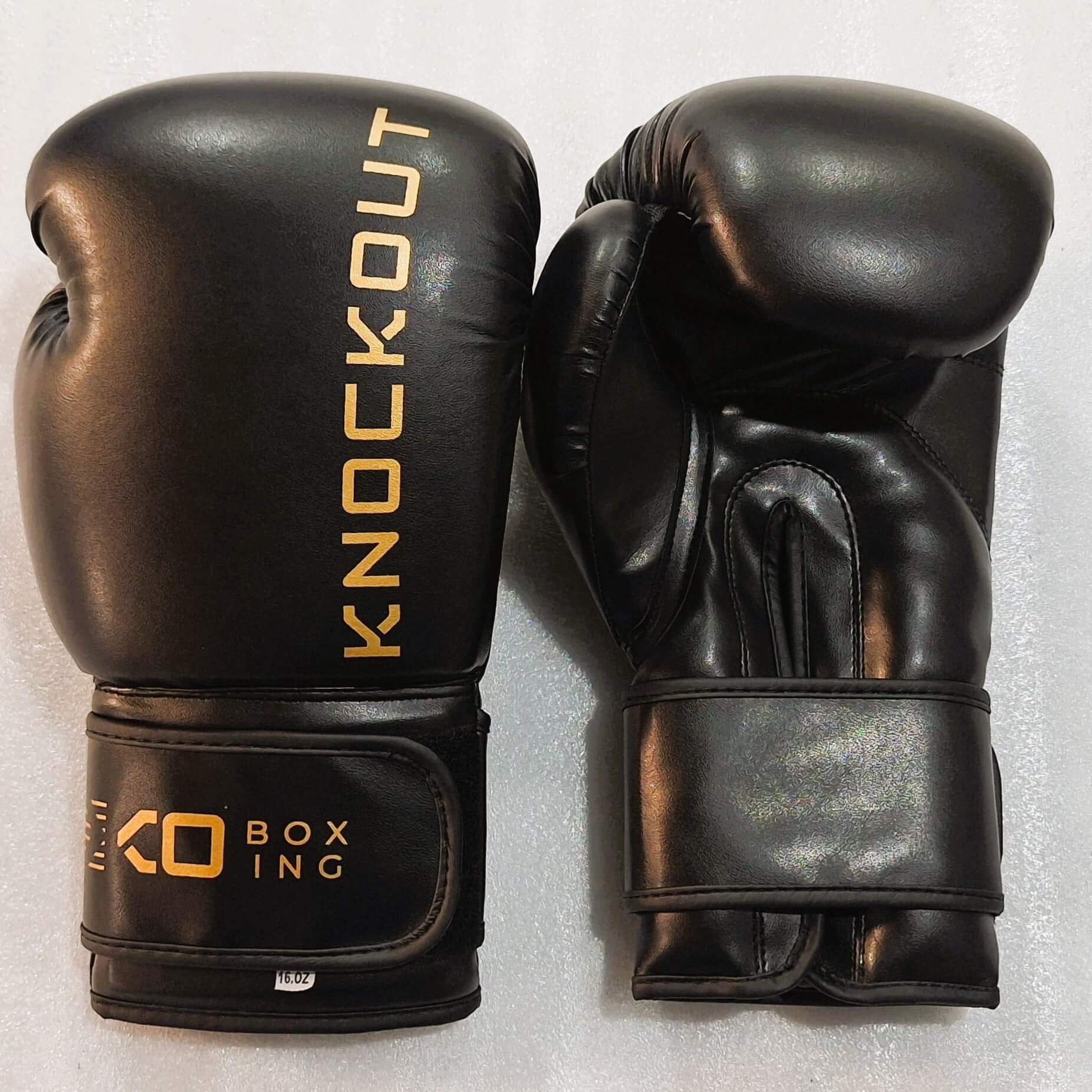Command attention with every punch. Knockout Boxing’s All-Black Gloves with Gold Logo bring a sleek, no-nonsense edge to your training arsenal. Designed for boxers who prefer a clean, professional aesthetic, these gloves feature a matte black exterior and palm, paired with a sharp metallic gold “KNOCKOUT” logo for a bold finish that reflects confidence and power.